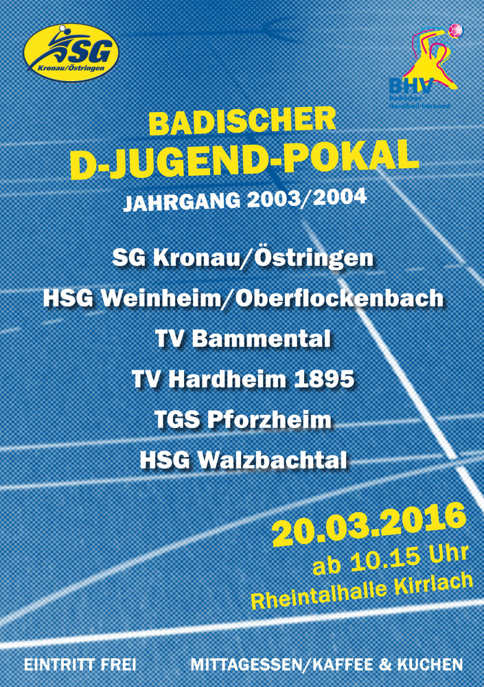 Am Sonntag den 20. März findet die zweite Auflage des Badischen D-Jugend-Pokal-Wettbewerbes statt, welcher vom Badischen Handball-Verband (BHV) veranstaltet und von der SG Kronau/Östringen in der Rheintalhalle in Kirrlach ausgerichtet wird. Bei dem Pokalwettbewerb treten die männlichen D-Jugendmannschaften der sechs Handballkreise an, welche jeweils die Kreismeisterschaft erringen konnten. Einlass in die Halle wird ab 10:15 Uhr sein und die Spiele finden von 11:00 Uhr bis 17:15 Uhr statt.