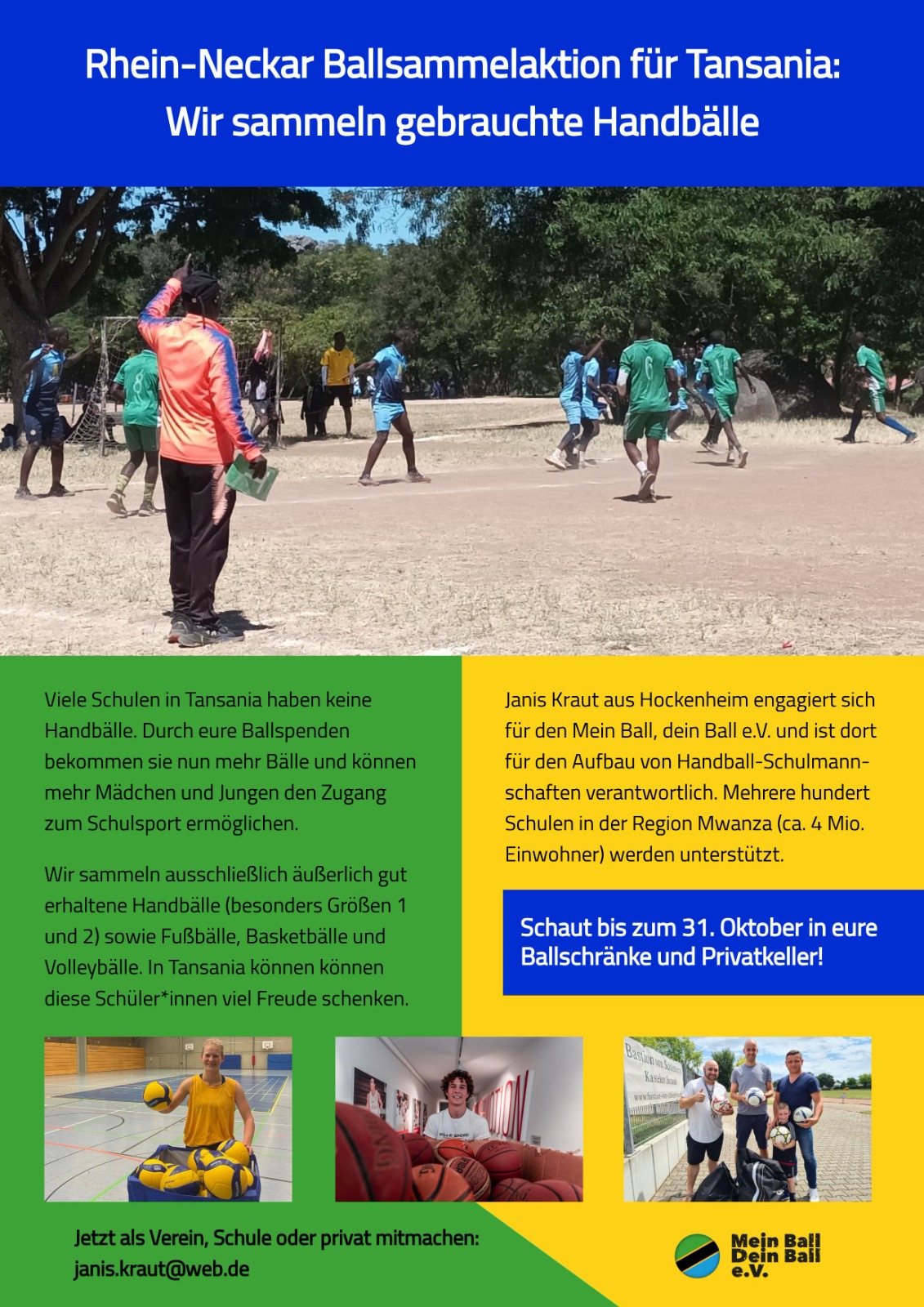 Janis Kraut, Handballspieler beim TSV Handschuhsheim, hat sich über den Verein "Mein Ball, Dein Ball e.V." für ein viermonatiges Praktikum in Mwanza, Tansania, eingesetzt. Der Mein Ball, Dein Ball e.V. ist ein gemeinnütziges, deutsch-tansanisches Entwicklungsprojekt. Sie fördern den systematischen Ausbau der vier populärsten Mannschaftssportarten im Land: Fußball, Volleyball, Basketball und Netball. Seit neustem sammeln sie auch Handbälle! Ihr Ziel ist es, eine nachhaltige Vereins- und Sportinfrastruktur in Mwanza aufzubauen: Mit Mannschaften von jung bis alt über unterschiedliche Sportarten und Geschlechter hinweg. Gemeinsam mit der lokalen Verwaltung bauen sie Sportstätten, fördern Vereinsgründungen und bilden gemeinsam mit den regionalen Sportverbänden ehrenamtliche Trainer sportlich und pädagogisch aus. Sie statten insgesamt über 1000 Schulen und Vereine mit Bällen aus und bauen über Spenden finanziert Schul- und Vereinssportzentren für je ca. 90.000 Euro. Mehr über den Verein erfahrt ihr hier.