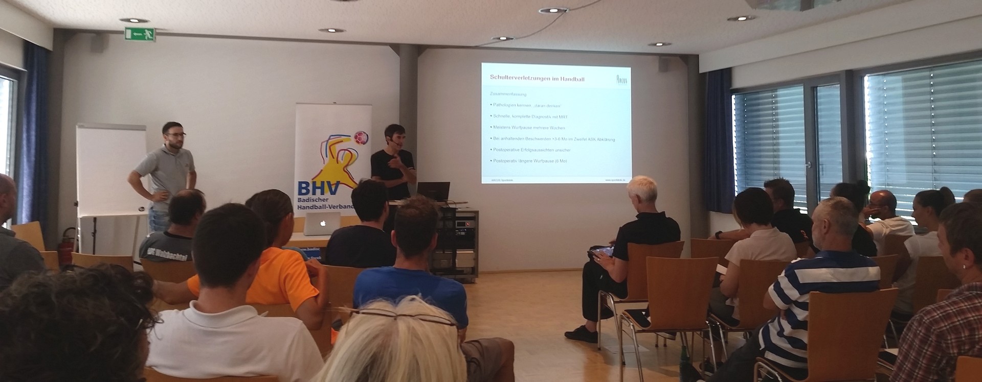 Am Samstag den 22.07.2017 bot der BHV in Kooperation mit den ARCUS Kliniken Pforzheim als BHV-Partner in Karlsruhe im Haus des Sports eine Fortbildung zum Thema der präventiven Maßnahmen im Handball an. Geleitet wurde die Fortbildung vom ärztlichen Direktor der ARCUS Kliniken Dr. Thomas Ambacher, der zu weiteren Spezialgebieten Matthias Kraus (Physiotherapeut, Rehamed Pforzheim) sowie Nils Petersen (Orthopädietechnik-Meister, Ortema GmbH) eingeladen hatte. Nach dem Einstieg in welchem typische Verletzungen im Handballsport dargestellt wurden ging Dr. Ambacher auf die typischsten Schulterverletzungen ein. Kraus gab viele in der Praxis direkt anwendbare Tipps in den Bereichen Aufwärmen/Koordination/Flexibilität sowie zum funktionellen Ganzkörpertraining. Nach der Pause erläuterte Dr. Ambacher die Auswirkungen der Ernährung auf die Prävention und Regeneration bevor Petersen mit einem Überblick über die verfügbaren Bandage und Orthesen zur Prävention sowie Unterstützung der Verletzungsregeneration die Fortbildung abschloss. Die 43 Teilnehmer*innen nahmen die Informationen aus erster Hand von absoluten Spezialisten wissbegierig auf, sodass die Fortbildung sicher einen Einfluss auf das ein oder andere Training oder die Spielvorbereitung in der nächsten Zeit haben wird.