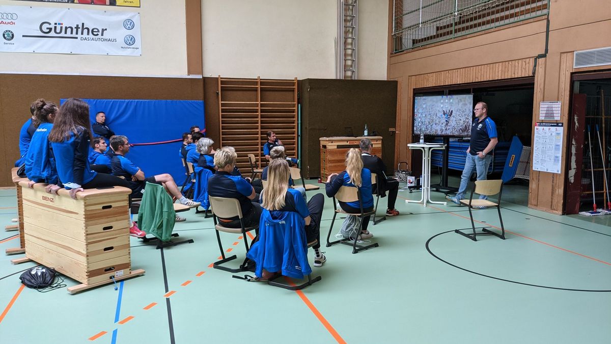 Danach führte Michael Schlegel, der vom TV Bürgstadt nach Hardheim kam, in das Trainingskonzept ein. Die Trainingsfachwarte Michael Schlegel und Gilles Orciari nutzten zusammen mit Jugendleiter Steffen Gärtner die corona-trainingsfreie Zeit und ersannen ein neues Jugendtrainingskonzept. Dabei wurde „das Rad nicht neu erfunden“, sondern das bestehende Konzept in Verbindung mit dem DHB-Trainingsrahmenkonzept auf den TV Hardheim zugeschnitten. Aufgrund der Vereinsfarben wurde es „Blau-Weißer-Faden“ genannt. Die Inhalte wurden vereinfacht und auf die aktuelle Situation des Jugendbereiches zusammengefasst. Es umfasst soziale Ziele (Einhaltung von Werten, Vorbildfunktion des Trainers u.a.), sowie sportliche Ziele (Besetzung aller Jugendklassen, Talentsuche, Talentförderung). Trotzdem lautet die Devise, dass man ausbildungs- statt erfolgsorientiert trainiert. Ebenfalls brachte Schlegel den anwesenden Trainern den Aufbau einer Trainingseinheit näher. Mit Handouts zu diesem Thema, sowie Trainingsinhalte entsprechender Altersstufen, verlieh er seinem Vortrag Nachhaltigkeit. Zur Einführung des „blau-weißen Fadens“ stellte er noch die interne Online-Plattform für die Trainer auf der Homepage der Handballer vor. Hier können die Trainer zwischen Videos und schriftlichen Aufzeichnungen wählen und entsprechendes Material für ihre Trainingseinheiten als „Spickzettel“ anschauen oder herunterladen. Gilles Orciari zeigte danach, welche Printmedien und Videos für Handball-Informationen zur Verfügung stehen. Nach der Mittagspause, die die Trainer zum regen Austausch nutzten, leitete Michael Schlegel mit seiner männlichen C-Jugend eine Demo-Trainingseinheit. Hier führte er Übungen vor, die im Minialter sowie auch im Erwachsenenbereich durchzuführen sind.