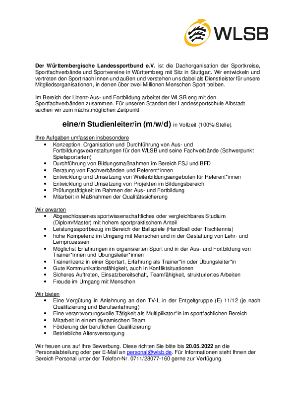 Der Württembergische Landessportbund sucht einen neuen Studienleiter/ eine neue Studienleiterin.