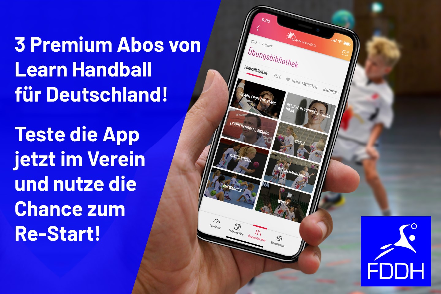 Melde jetzt direkt deinen Verein bei dieser Förderung des FDDH zum Re-Start an und schreibe eine E-Mail an germany(@)learnhandball.com oder info(@)fddh.de mit dem Betreff - FDDH fördert den Kinderhandball. Direkt nach der Einführungsveranstaltung mit euren Trainer:innen und dem Learn Handball Team seid ihr im Losverfahren für die 1- jährige Premium Förderung.
