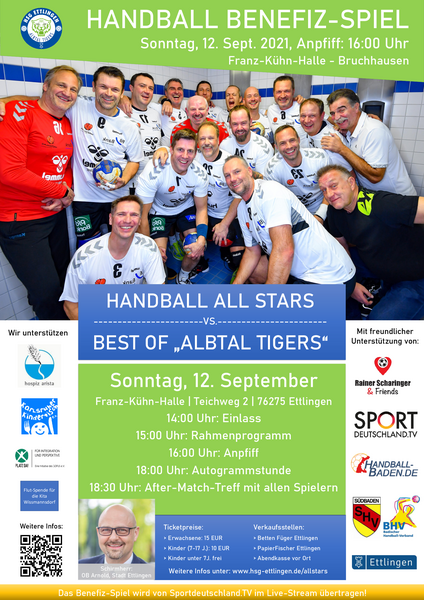 Handball spielen für den guten Zweck! Für die Auftritte der „Handball All-Stars“ ist das die tragende Idee. Ehemalige Nationalspieler, darunter Europa- und Weltmeister, Olympiateilnehmer sowie Deutsche Meister und Pokalsieger, bilden das Gerüst dieses Legenden-Teams! Obwohl es nicht immer einfach ist, die Termine zu koordinieren, treffen sich seit Juli 2010 die Handball All-Stars in unregelmäßigen Abständen immer wieder zu Benefizspielen. Nach mehr als 18 Monaten Corona-bedingter Zwangspause folgt das All-Star-Team nun der Einladung der „HSG Ettlingen – die Albtal Tigers“ und gastiert am Sonntag, den 12. September 2021 in der Franz-Kühn-Halle in Ettlingen, Ortsteil Bruchhausen.