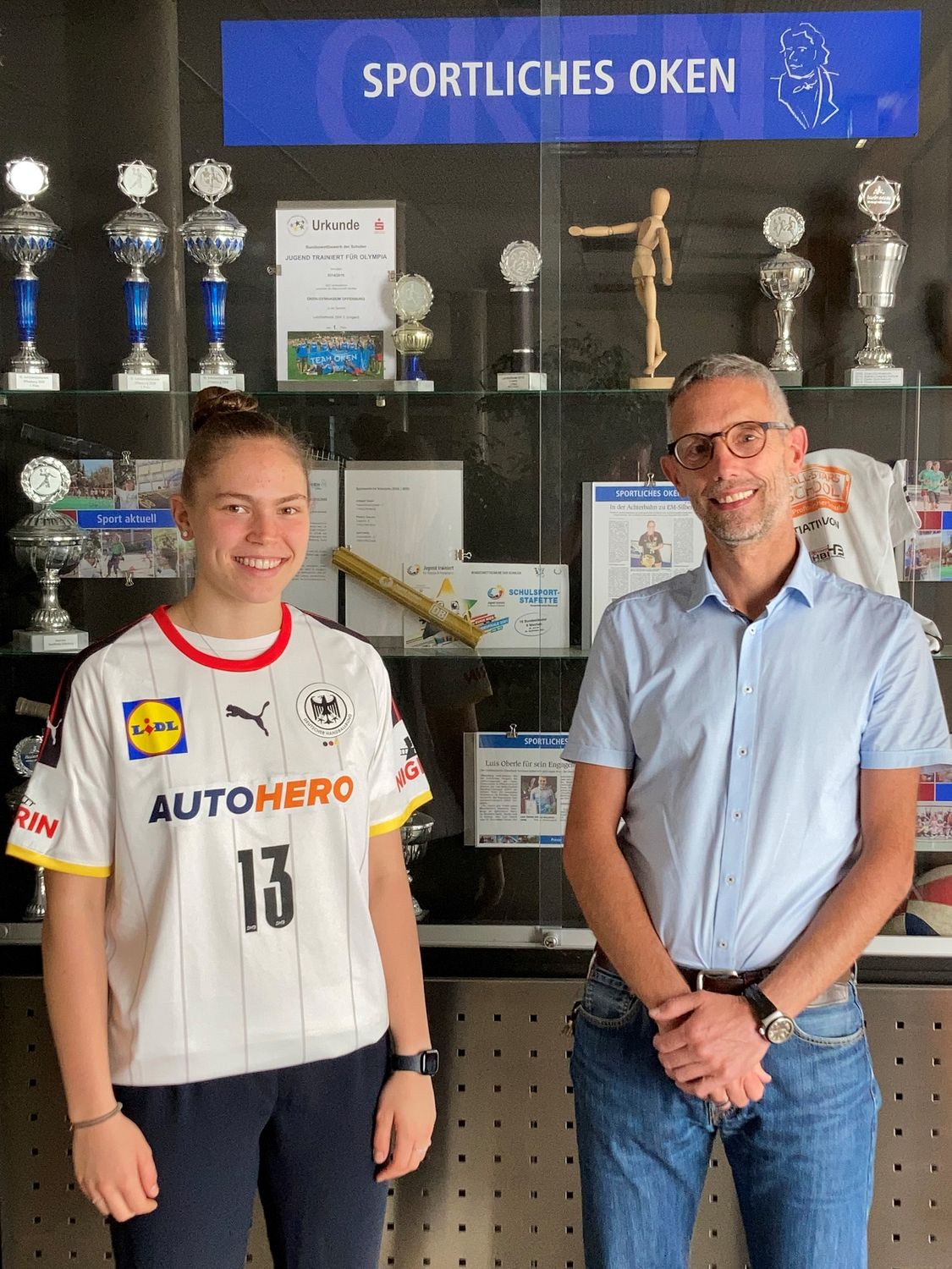 Der Schulleiter des Oken-Gymnasiums Herr Joost konnte in seiner Funktion als Vorsitzender des Regionalen Spitzensportzentrums Offenburg, Ariane ein eigens für sie von Hendrik Pekeler signiertes DHB-Trikot überreichen.