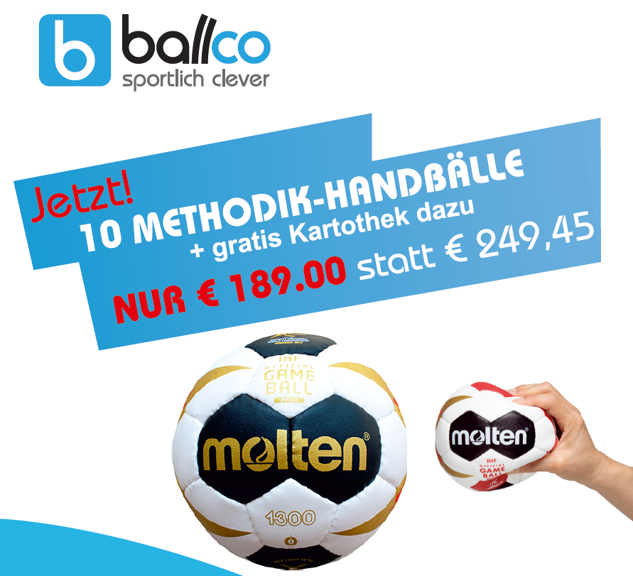10 Methodik-Bälle für den Preis in Höhe von 189€ (statt 249,45). Zusätzlich erhalten alle Vereine eine Kartothek mit 50 Trainingskarten für Ballhandling und Torwürfe gratis dazu.