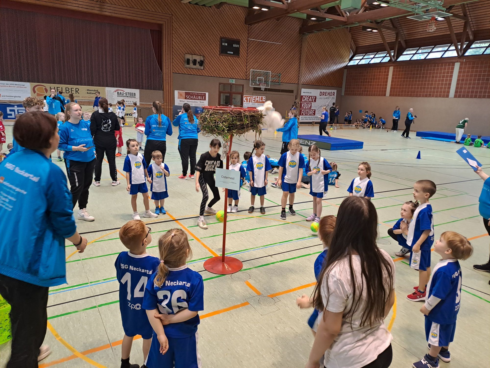 Pünktlich um 10 Uhr fanden sich ca. 140 Kinder in ihren 12 Mannschaften in der Oberndorfer Neckarhalle ein. Unter anderem hatten die Minis aus Spaichingen, Rietheim, Dunningen, Balingen, Nendingen, Baar und der HSG Neckartal ihr Kommen angekündigt. Nach dem Einlaufen der Kinder mit der passenden Musik und der namentlichen Erwähnung aller Kinder gab es eine gemeinsame Erwärmung mit Teilen der weiblichen B-Jugend der HSG. Anschließend konnten die Nachwuchshandballer an den 8 Einzelstationen ihre Geschicklichkeit und Treffsicherheit unter Beweis stellen. Unter anderem gab es die Möglichkeit Karotten, Ringe, Bälle und einen Osterhasen in verschiedene Ziel zu werfen. Beim Eierlauf kam es auf das Feingefühl und beim Osterhasen Kegeln auf die Treffsicherheit an. Natürlich konnten sich die Mannschaften auch untereinander messen und beim Mattenball, Turmball und Aufräumen ganz nach dem Motto „ Erlebnis statt Ergebnis“ verausgaben. Bei der gemeinsamen Siegerehrung bekamen alle Kinder neben einem tobenden Applaus, eine Goldmedaille und einen Sandkasteneimer mit einigen Schleckereien.