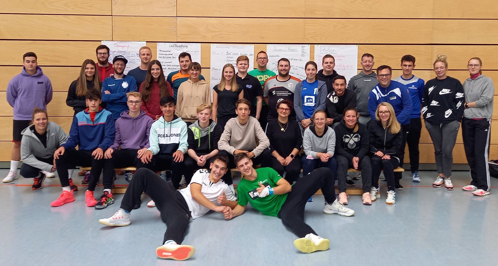 Reges Interesse zeigten die Teilnehmer in dieser 1 1/2-tägigen Ausbildung an den vielfältigen Themen rund um den Kinderhandball. Die Ausbildung wurde, auch aufgrund der Corona-Lage, neu konzipiert; es gab einen Onlineteil für Zuhause und einen Präsenzpart in der Sporthalle. Die Teilnehmer mussten daher im Vorfeld als Vorbereitung der Ausbildung einige Lernvideos online zuhause anschauen. So wurde neben dem Aufbau einer Mini- bzw. E-Jugend-Trainingseinheit, das Kinderhandballkonzept des Deutschen Handballbundes (DHB) und des Handballverbandes Württemberg (HVW) sowie der pädagogische Umgang mit Kindern und Jugendlichen besprochen. Eine enge Verknüpfung von Theorie und Praxis, auf der Grundlage der Rahmentrainingskonzeption des DHB von 2018, brachte den Teilnehmern eine einheitliche Struktur der Ausbildung von jungen Handballspielern über fünf Förderstufen von den Minis über die E-Jugend bis hin zu den Erwachsenen näher. Das richtige Aufwärmen mit vielseitiger und nicht nur handballspezifischer Koordinationsschulung und spielerischen Kräftigungsübungen zu Beginn einer Trainingseinheit, Spielreihen und Spielformen im Handball, sowie die allgemeine Grundlagenausbildung waren ebenso wie das Erlernen des Schlag- und Sprungwurfes bei Minis und ungeübten E-Jugendlichen und das Erlernen des Handballspiels von der Picke auf bis hin zum Handballspiel 4+1 Themen der Ausbildung. Das richtige Abwehr- und Angriffsverhalten sowie die Entwicklung der Spielfähigkeit waren große Blöcke in der Ausbildung.